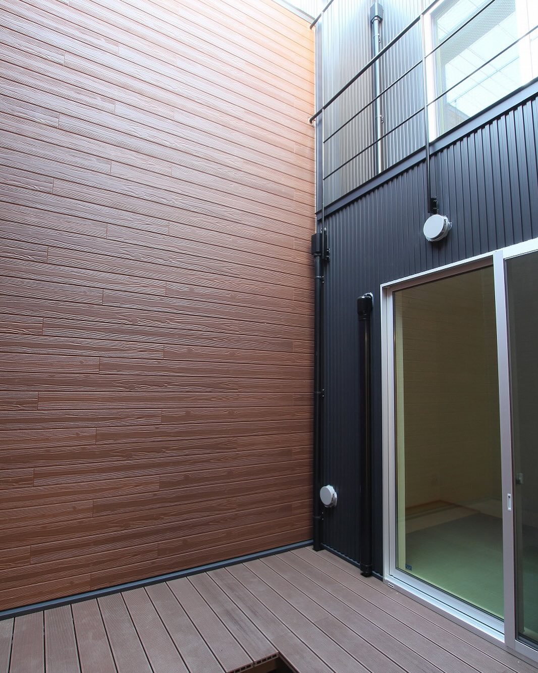 2階テラス。プライバシー性を確保するために、壁と屋根に囲われた半屋外的な空間となっている。床は木製デッキ材、奥には屋外水栓も見える。