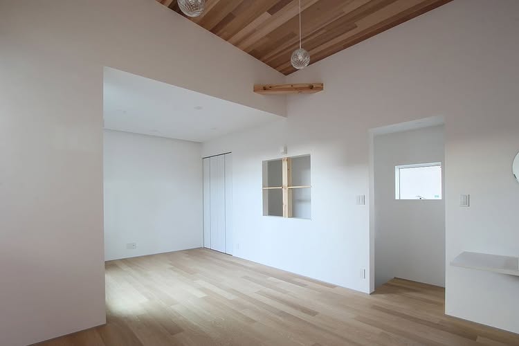 2階LDK。天井高さに変化をつけ、落ち着いた空間構成となっている。床はナラフローリング、天井はレッドシダー貼り。