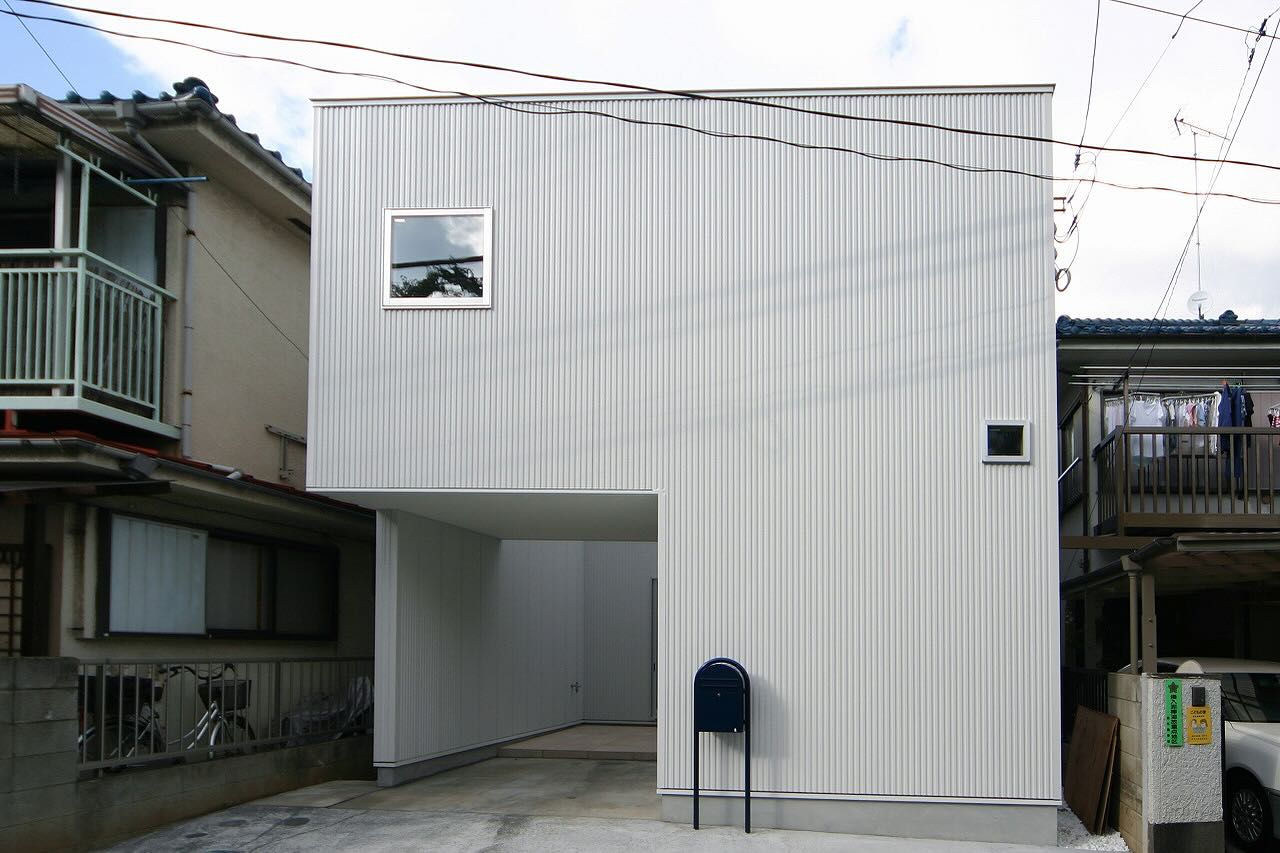 木造2階建ての狭小住宅。道路側を閉じて中庭に面して開く平面構成。プライバシーを守りながら光を取り込む設計になっている。外壁はガルバリウム鋼板。