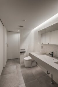「洗面及びトイレを見る」写真ですが、シンプルで明るい空間ですね。