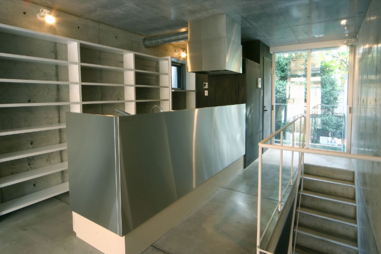 2階キッチンを見る。壁と天井はコンクリート打ち放し、床はモルタル金ゴテ仕上げ。階段は片持ちコンクリート。キッチンは造作。ストイックな空間となっている。