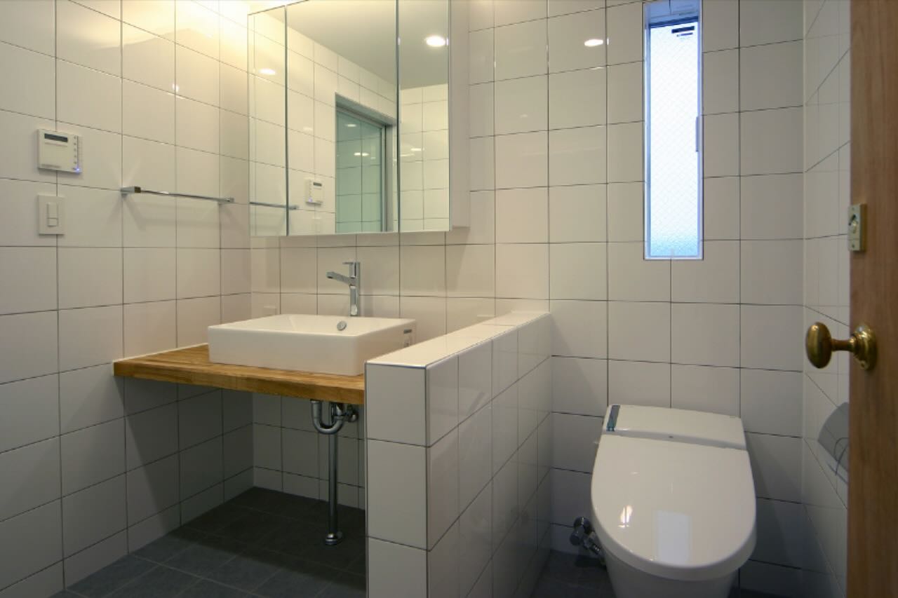 タイル張りのパウダールーム。トイレと一体で開放的。