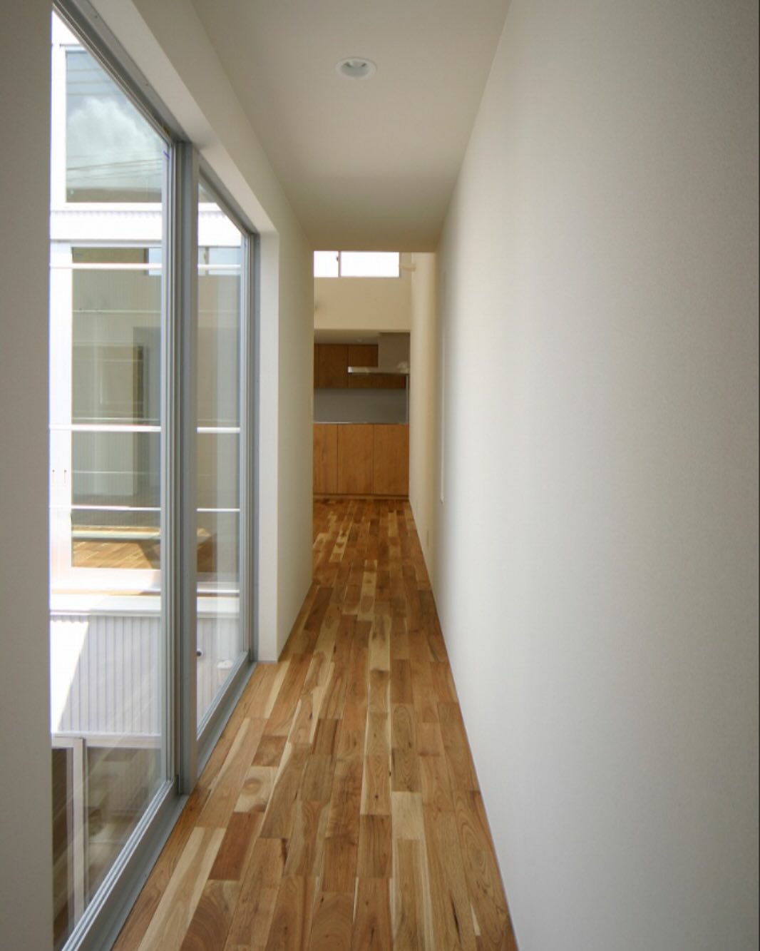 2階中庭に面した渡り廊下。渡り廊下の天井は低く抑え、中庭に目線が行くようにしている。渡り廊下を抜ければ天井高さ3.4mのLDK、劇的に空間が変わるように設計している。床材はシベリアンウォールナット。