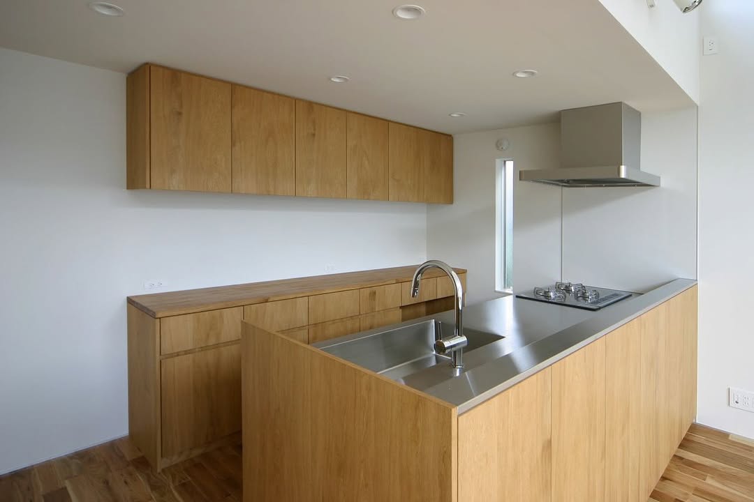 2階キッチンを見る。キッチンは収納も含め、造り付けの特注キッチン。床材はシベリアンウォールナット。