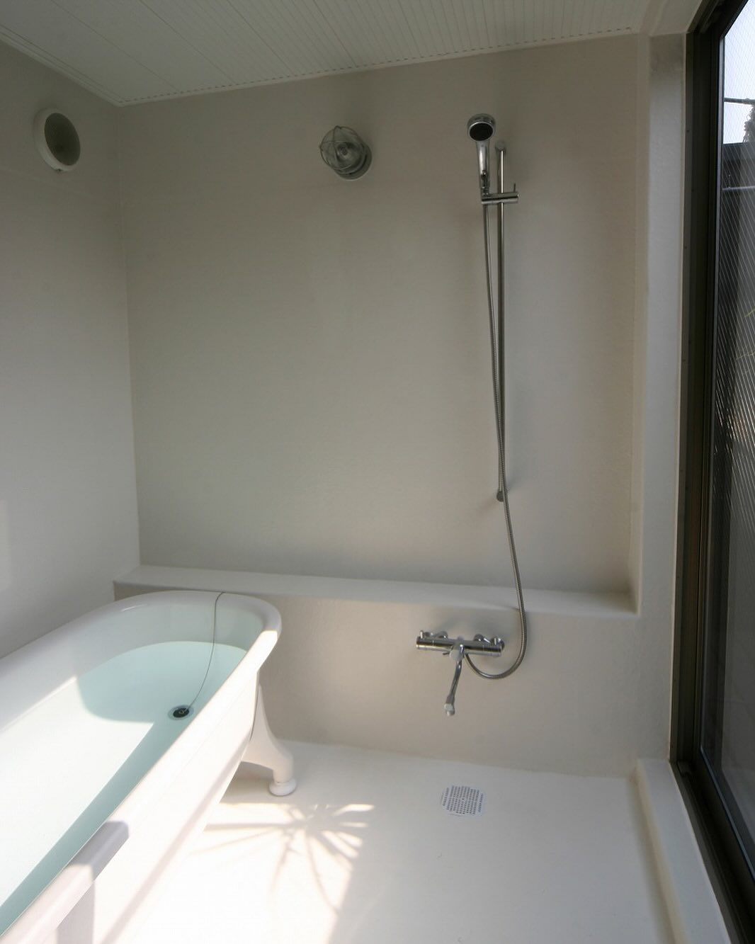 テラスに面した開放的なバスルーム。テラスからの陽光を受け、朝風呂も気持ちが良い。ねこ脚のシンプルなバスタブ。